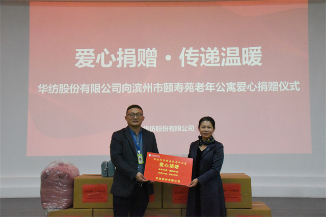 導(dǎo)讀:11月4日,公司舉行向濱州市頤壽苑老年公寓捐贈愛心物資的活動儀式。家紡分公司副總經(jīng)理曲偉華、濱州市頤壽苑老年公寓院長鄢桂珍等參加了捐贈儀式。